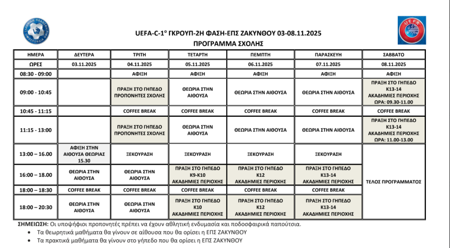 Η Ε.Π.Σ. Ζακύνθου ενημερώνει το κοινό αλλά και τους υποψήφιους προπονητές ότι η δεύτερη φάση της Σχολής UEFA C θα διεξαχθεί στο νησί μας σε δύο διαφορετικά γκρουπ.