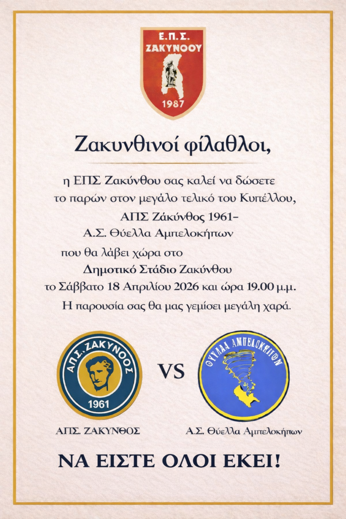 Η ΕΠΣ Ζακύνθου ανακοινώνει ότι διαιτητές στον αυριανό μεγάλο τελικό Κυπέλλου που θα γίνει στο Δημοτικό Στάδιο Ζακύνθου στις 19.00 μ.μ. μεταξύ των ΑΠΣ Ζάκυνθος 1961- Α.Σ. Θύελλα Αμπελοκήπων, διαιτητές της αναμέτρησης θα είναι οι: Μπέης Βασίλης (Διαιτητής), Στράτος Χ.- Σολωμός Ν. (Βοηθοί), Τρομπούκης Θ. (4ος) και Μποζίκης Αντ. (Παρατηρητής διαιτησίας).