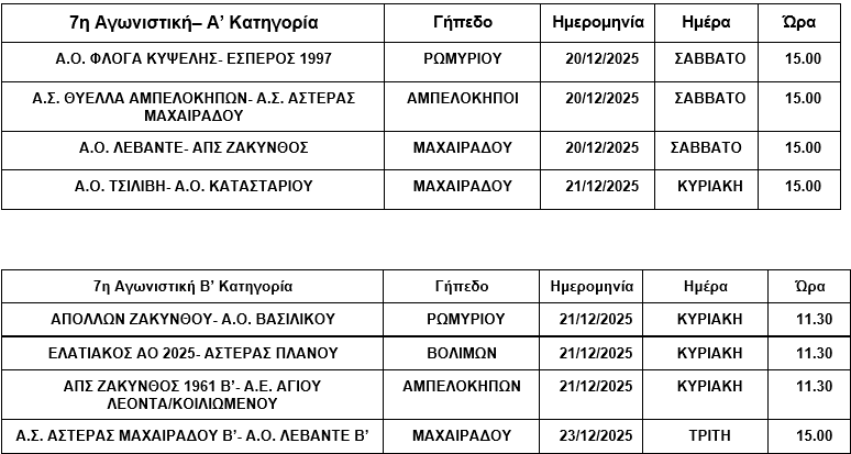 Η 7η αγωνιστική σε Α’ και Β’ Κατηγορία! * Η αναμέτρηση Δόξας Πηγαδακίων- Δόξας Λιθακιάς θα οριστεί με την έλευση του νέου έτους.