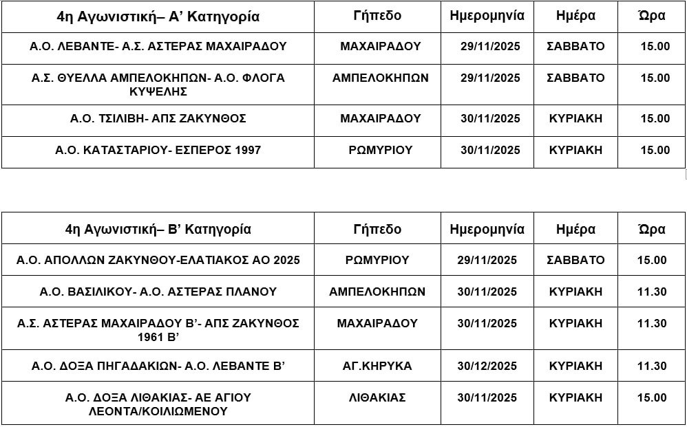 Το Πρόγραμμα της 4ης αγωνιστικής σε Α’ και Β’ Κατηγορία!